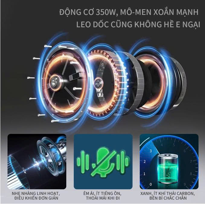 • Động cơ 350W với mô-men xoắn cao, giúp leo dốc dễ dàng