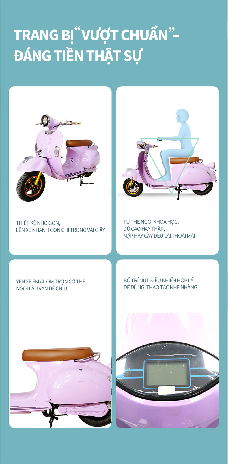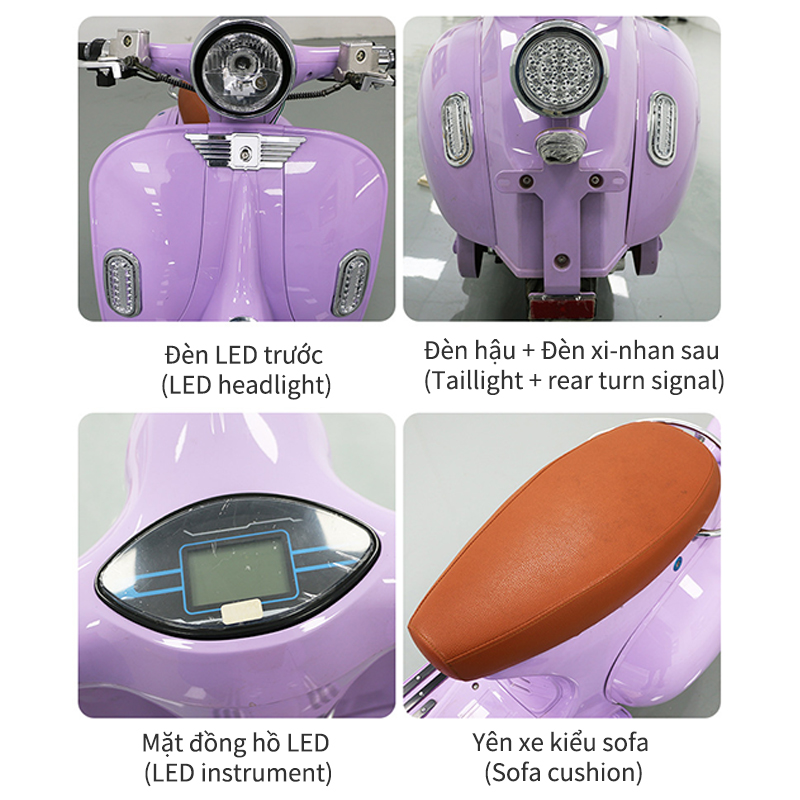Yên xe sofa êm ái, đèn LED hiện đại, mặt đồng hồ điện tử rõ nét, kiểu dáng nhỏ gọn nhưng vẫn đầy đủ tiện nghi.